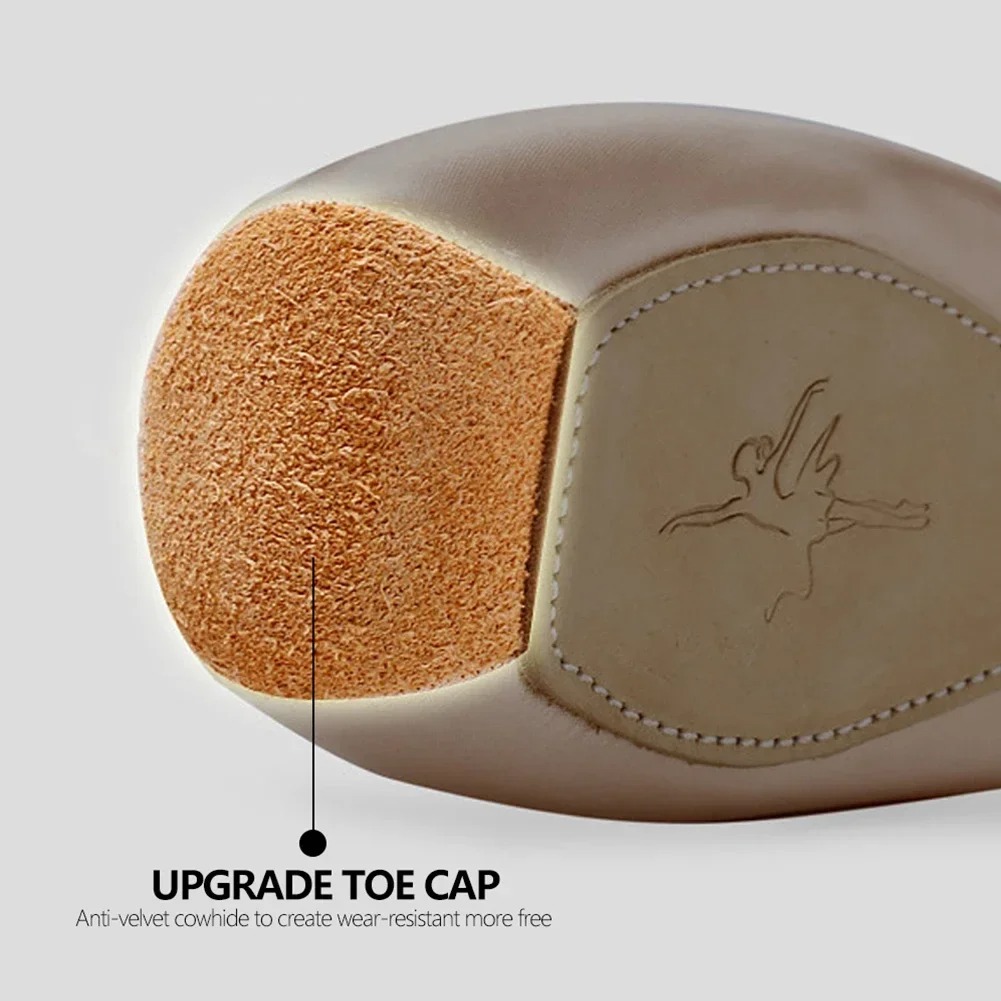 The suede sole ensures optimal grip, and the reinforced leather toe cap enhances durability even with heavy use. They come with long, sturdy satin ribbons ready to be tied around the ankle.
