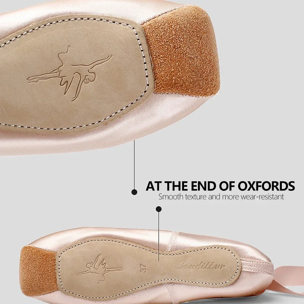 Satin ballet pointe shoes with suede sole and reinforced toe cap for enhanced stability and durability.